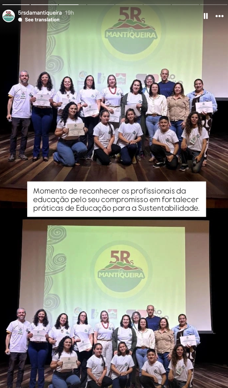 Entre os meses de setembro e outubro, os municípios de São Bento do Sapucaí e Santo Antônio do Pinhal promoveram eventos sobre os 5Rs da Mantiqueira, encontros dedicados à educação ambiental e à valorização de práticas locais de sustentabilidade. A programação das Feiras de Educação para a Sustentabilidade foi marcada por atividades culturais, exposições educativas, palestras, rodas de conversa e mostras de trabalhos escolares. Crianças, professores e profissionais da educação foram reconhecidos publicamente por seu papel essencial na disseminação dos 5Rs — Repensar, Recusar, Reduzir, Reutilizar e Reciclar — destacando a importância da separação e destinação correta dos resíduos e o protagonismo das escolas no fortalecimento da cultura da sustentabilidade.